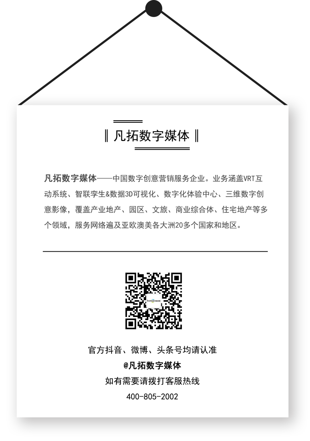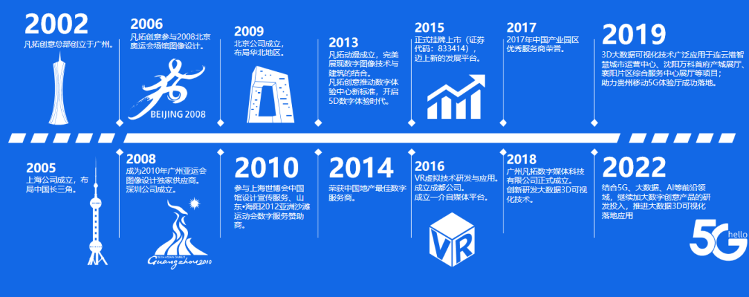 关于凡拓数创 凡拓数创成立于2002年,是国内领先的数字创意科技企业。 凭借20年专注数字多媒体展示服务、研发3D可视化技术和前沿技术的优势,凡拓数创为客户提供数字展示一体化服务,开发包括创意策划设计、3D数字内容制作、VR/AR展示、信息软件及系统集成、数字化体验中心/展厅等。 发展至今,凡拓数创拥有北上广深成都武汉6大数字创意中心和西安、长沙2个国内分支机构,是业内资质齐全,实力雄厚的综合性服务商。服务范围涵盖房地产、商业文旅、产城产办、新基建、智慧城市、文化文博等领域,服务网络遍及亚欧澳美各大洲20多个国家和地区。 凡拓曾连续为北京奥运会、上海世博会、广州亚运会、海阳亚沙会四大国际盛会提供展示数字创意图像服务,并成功打造2000多个智慧城市体验馆、产城展示中心、规划馆、博物馆、科技馆、企业馆、主题馆等标杆性项目,累计多媒体创意内容及展项超10000个。 全生命周期的数字场景创新服务 1 多媒体展览展示 凡拓借力新一代信息技术的发展,提供数字展厅一体化解决方案。融合互动系统、虚拟现实、立体影像等数字技术,创意打造数字沙盘、数字影厅、艺术多媒体装置、商业多媒体展示等展项。 依托数字化体验中心的打造重点,展现区域规划、企业文化、产品信息等内容,为客户提供三维数字内容创意服务及系统集成整合服务,服务房地产、产业园、文旅、生物医药、新能源、智能通信、文化文博等多领域需求,打造具有高科技视觉震撼感的品牌展厅、售楼部展厅、园区展厅、虚拟展厅等数字智慧体验中心。 产业园展厅 - 中国云教育产业园展示中心 城市数字规划馆 - 杭州未来科技城规划展馆 数字博物馆 - 广州国家档案馆 新能源企业展厅 - 广州环投集团资源热力电厂宣教展示中心 品牌展厅 - 贵州移动5G体验厅 党政文化馆 - 广州越秀区党建服务中心 点击图片进入详细页面 如何把品牌馆变成网红打卡地?| 凡拓x富力 破茧而出,腾龙换凤,多元场景演绎科创展厅 预见长沙未来,欢迎来到人工智能新世界 凡拓x天安 | 诗意的生命,别具一格的空间呈现 点击观看视频 2 元宇宙-数字孪生 (1)► 凡拓智联孪生平台 凡拓元宇宙数字孪生基于3D可视化、数字孪生、仿真模拟、实时渲染、区块链、云端渲染、多人联机等技术,结合虚拟数字人参与互动,赋能城市、园区、工业、农业、产业、文旅等场景进行真实复现、数据可视化、模拟推演等,实现城市物联的统一调控、智能调度,真正让机器智能与人类智慧高度协同。 凡拓智联孪生平台从整个产业的应用场景出发,以平台为载体,实现规划设计、招商运营、营销推广、运营增效的全营销周期的数字化赋能服务,满足多层面、多系统、多模块的综合性数字化及可视化需求,让运营管理更便捷,更高效。 农业元宇宙:数字孪生+数字人擘画“三农”新时代 制造业如何变身数字工厂,让生产管理更高效? (2)► FT VRT 3.0智慧营销系统 凡拓VRT互动展示系统融合多项国内外顶尖技术,展示项目“区位信息”、“户型交互”、“虚拟漫游”体验、“家居家装”应用等数字化信息,实现全户型、全园林实时漫游等虚拟沉浸交互体验。 点击图片进入详细页面 聚焦两会 | 2021年数字化加速,线上营销成为新战场 路劲•天隽汇VRT互动看房系统—凡拓精匠品质,成就港奢风范! 3 影视创意 凡拓深耕数字创意动画制作20年,经过多年的3D核心技术积累,拥有14项技术专利、243项软著,配备8K/4K电影级专业软件和渲染设备,以及海量的素材库。 凡拓动态数字创意服务采用涵盖3DMax,Maya,UE4,C4D等多类专业软件以及各类拍摄创作而成,并通过三维场景、特效包装、蓝屏抠像、航拍合成等多种手段实现。 为不同的客户提供定制化创意服务,凡拓数创已打造包括城市规划片、地产影视片、品牌宣传片、产业宣传片、文旅宣传片、产品宣传片等多类型数字创意影片。年均500000+秒影视创作,累计创作10000+件各行业代表作品。 点击图片进入详细页面 凡拓数创影片佳作 | 中国的山水系 鉴云龙写意之境 繁华深处的院墅,重塑山居美学 来自东方的神秘力量,正席卷风云 |三维影片 点击观看视频 4 新媒体应用 比视频更懂流量,比流量更懂内容。凡拓新媒体应用包括元宇宙营销新模式、原创内容数字化矩阵、数字创意精准营销三大板块,服务内容涵盖视频全案、新媒体运营、元宇宙空间打造、虚拟IP定制等,为客户提供品效合一的全周期的新媒体营销解决方案。 (1)► FT-META元宇宙交互平台 FT-META元宇宙交互平台是一款集合了3D可视化、仿真模拟、实时渲染、虚拟数字人、区块链、云端渲染、多人联机等技术为一体的面向企业级及个人用户的元宇宙空间的交互类软件。 可应用于数字展览、营销、社交、会议等不同的应用场景,同时提供了可即点即用的云端版与稳定强大的本地版任选择。 克隆现实 沉浸视界 巨量场景 时空瞬移 互动十足 打破边界 基于凡拓数创二十余年的数字资产积累,打造的专属元宇宙空间可通过1:1完美复刻真实世界,实时云端渲染场景,快速定制企业专属空间,虚实无缝衔接,打造极致的沉浸式视界,同时可拥有沉浸视界、人物体验、游戏互动、3D展示、时空瞬移等丰富的互动体验。 (2)► 虚拟数字人 探索品牌营销的新切入口,凡拓数创打造的虚拟偶像/代言人、虚拟员工,正逐渐发挥更大