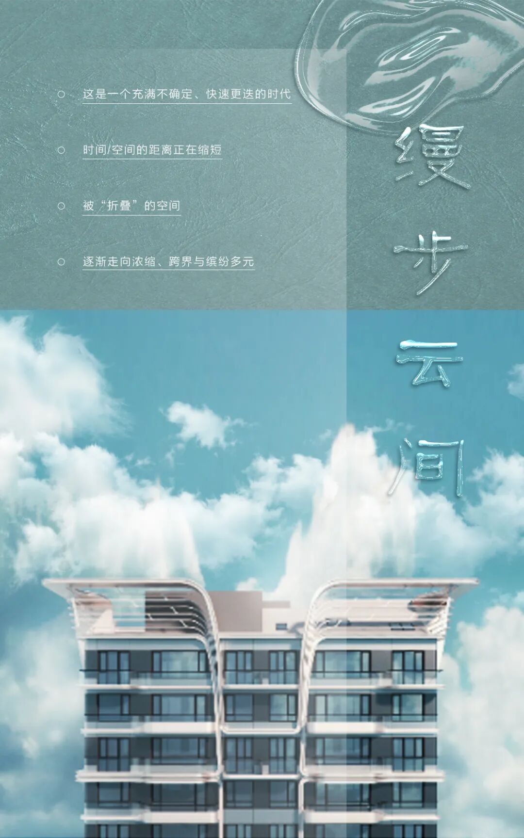 为达到最佳观看效果,请锁定屏幕横屏观看 预见未来的最好方式,是先行于时代。 — 合生·缦系 合生缦云洞察时代痛点,择址北京东三环金轴-CBD国际生态区延承缦系豪宅奢华基因,将“折叠”理念引入人居概念,成就城市新贵轻奢的新生活。 凡拓策划团队从“折叠空间”的理念出发,衍生“没有边界、互相连续的世界”的概念,以全新视角打造与城市共生的生活内涵,与菁英圈层发生精神联结。 从三折幕影像语言预见轻奢主义城市生活的未来想象,成就匹配圈层人士的乐居归心聚场。 //// 岁月温柔流淌 从纷繁变幻的大自然中汲取创造灵感 层层叠叠的多重植被、造景构建的自然秘境 焕新美好的生活向往 //// 自然提供了我们生存的基础 也焕新着蓬勃的新生之境 勾画了一幅奢享惬意自由 与慢时光的现代人居画卷 //// 在“270°”天空奇境 看淡世事沧桑,消除烦忧 藏纳回归宁静的日常情趣 承载现代人静谧栖居的心灵淬炼 //// 风雅于外,宁逸于心 奢享艺术臻境,跟随四季流转 品味时光之美 感知禅意内敛的空间 彰显室内原生隐奢的气质 //// 在折叠世界中一同探索、发现…… 发现空间之外的都会想象 不束缚对生活的态度 不止步对未来的憧憬 于此, 实现理想生活的每一种可能 时间缓缓,日子慢慢。凡拓创造的万千视界,演绎着静谧的生活内涵,创启一方稀贵而不事张扬的都市秘境。